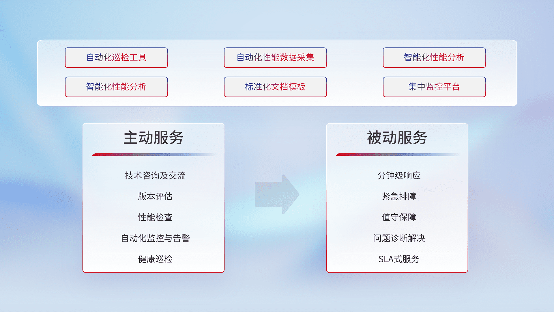 智能化工具和标准化文档,,保障服务质量,,,,提供主动服务(包含技术咨询、、、版本评估、、、性能检查、、、自动化监控与告警、、、健康巡检)和被动服务包含(分钟级响应、、、紧急排障、、值守保障、、、问题诊断解决、、SLA服务)。。